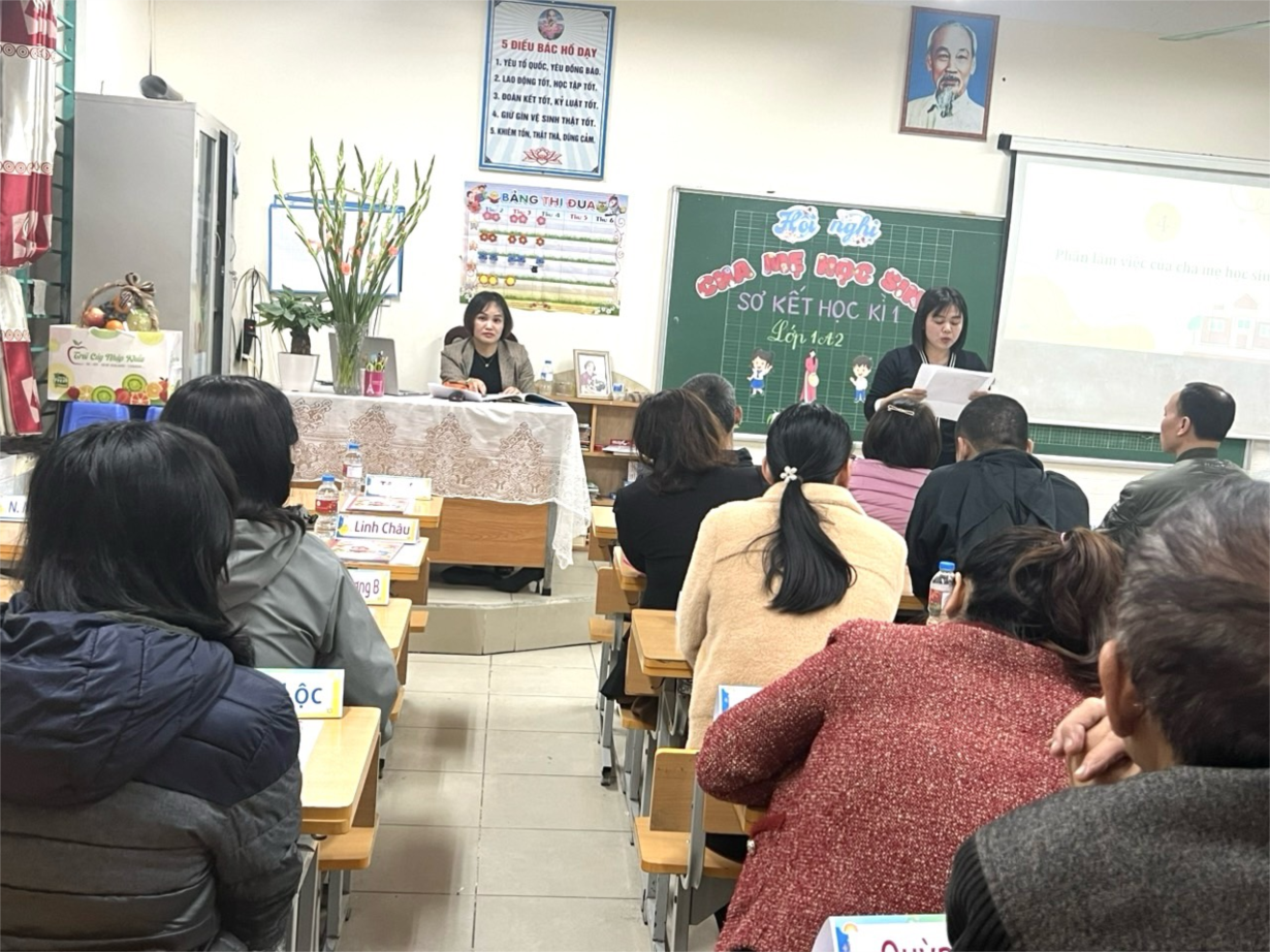 Họp phụ huynh là hoạt động thường niên giữa giáo viên chủ nhiệm với các bậc phụ huynh học sinh để trao đổi, chia sẻ về tình hình học tập, nề nếp của con em mình. Mở đầu buổi họp, GVCN đã báo cáo về đặc điểm tình hình, các hoạt động cùng một số thành tích của nhà trường trong học kì I. Những thành tích nổi bật và rất đáng tự hào ấy phần nào đã khiến các bậc phụ huynh thêm tin tưởng hơn vào môi trường sư phạm mà con em mình đang học tập và phát triển.