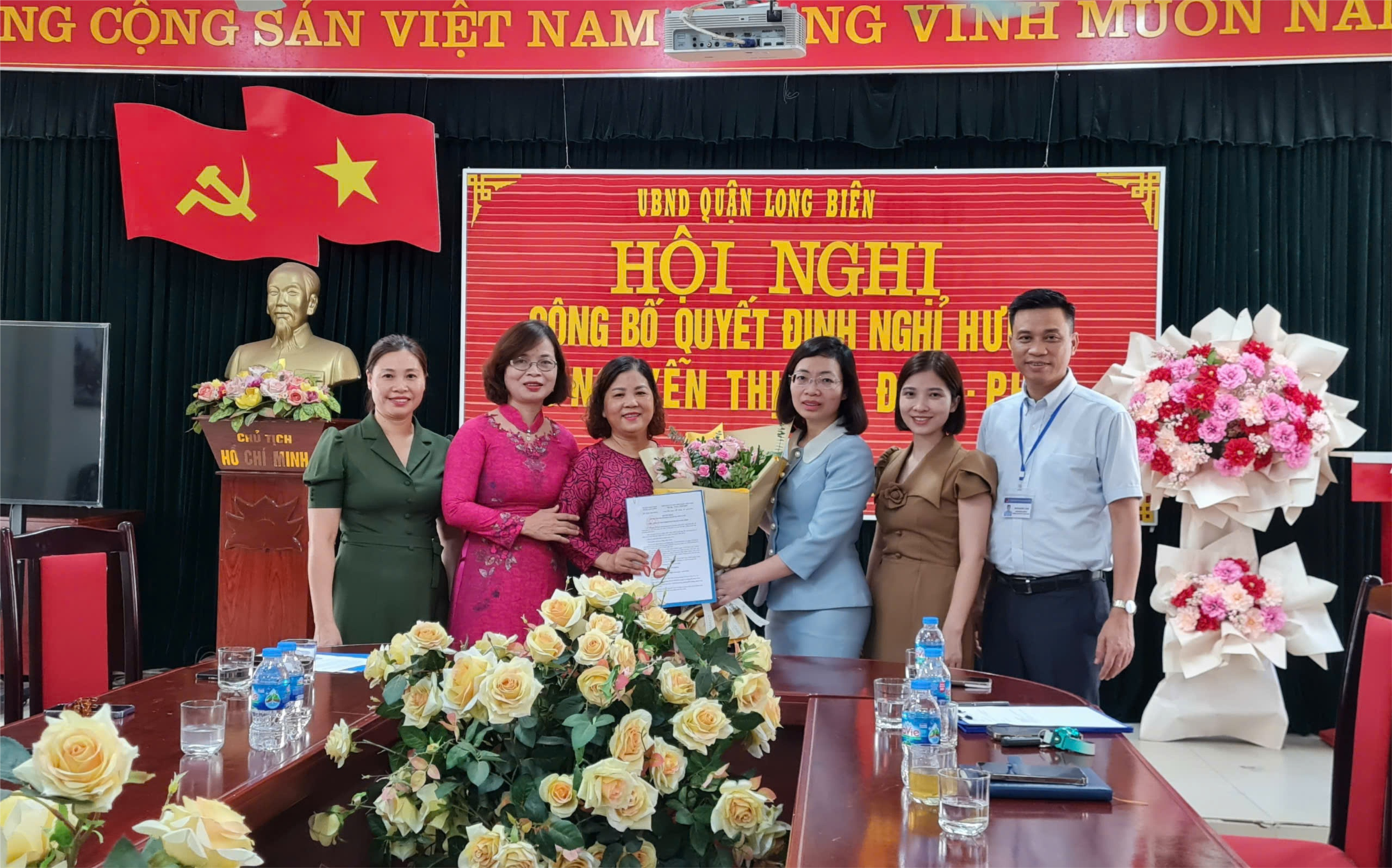 Đồng chí Nguyễn Thị Thu Hằng- Trưởng phòng Nội vụ quận Long Biên trao quyết định nghỉ hưu cho đồng chí Nguyễn Thị Phi Điệp - Phó Hiệu trưởng nhà trường