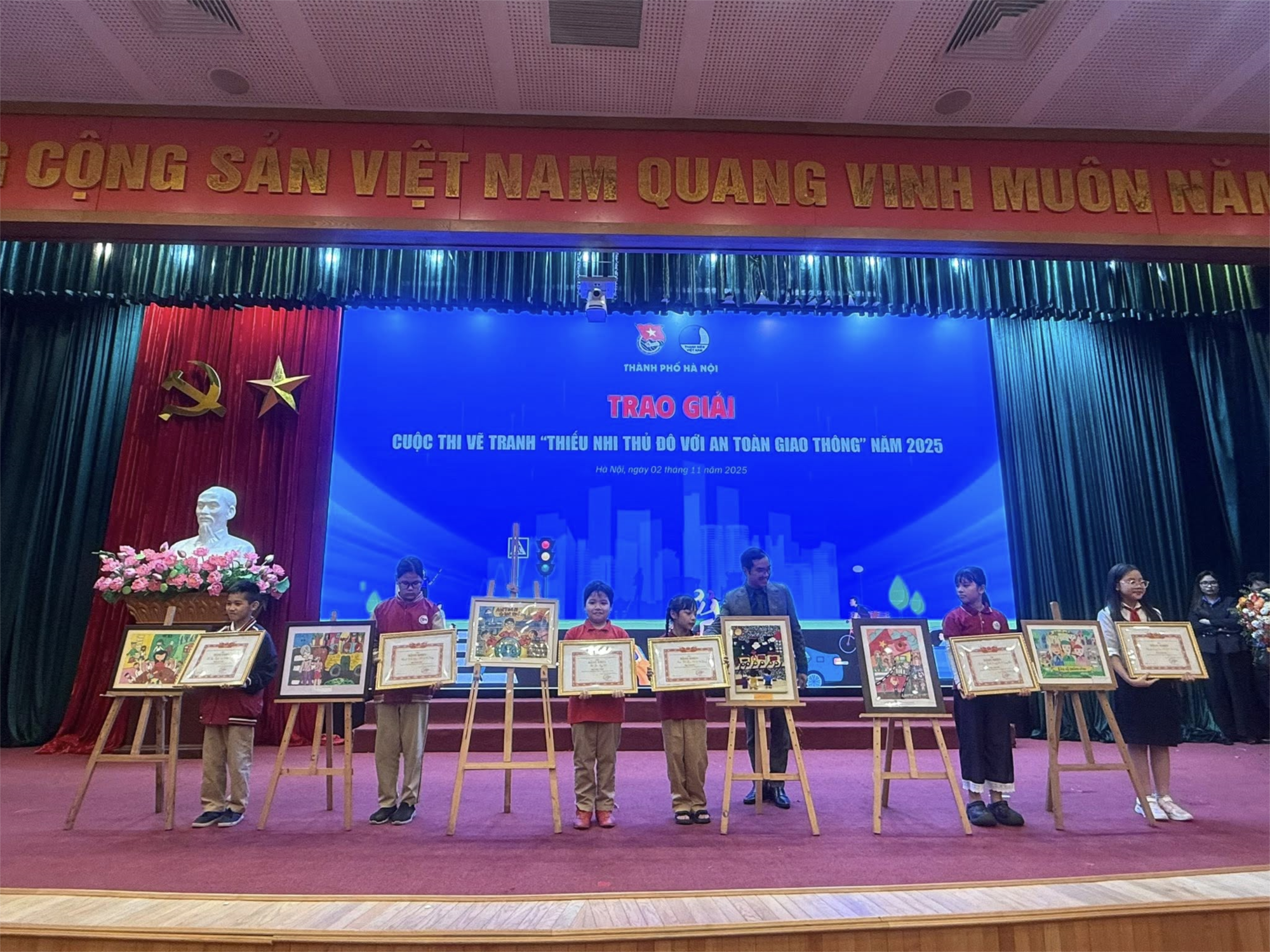 Chiều ngày 2/11/2025, tại cuộc thi “Thiếu nhi Thủ đô với An toàn giao thông năm 2025”, các em học sinh Trường Tiểu học Ngô Gia Tự (quận Long Biên, Hà Nội) đã mang đến những tác phẩm hội họa rực rỡ sắc màu, lan tỏa thông điệp ý nghĩa về an toàn giao thông.