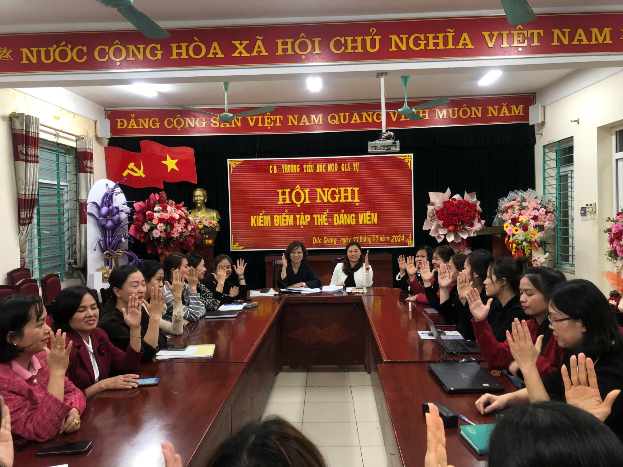 Hội nghị Kiểm điểm Tập thể và Đảng viên Chi bộ Tiểu học Ngô Gia Tự đã diễn ra thành công tốt đẹp. Thông qua việc tự kiểm điểm, đánh giá công tác của tập thể và từng đảng viên, hội nghị không chỉ giúp các đồng chí trong chi bộ nhận thức rõ hơn về trách nhiệm của mình trong công tác giáo dục mà còn góp phần xây dựng Chi bộ ngày càng vững mạnh, đoàn kết, đồng thời nâng cao chất lượng giáo dục cho học sinh. Với những giải pháp cụ thể và quyết tâm cao, Chi bộ Tiểu học Ngô Gia Tự sẽ tiếp tục phát huy những thành tích đạt được, phấn đấu hoàn thành xuất sắc các nhiệm vụ trong năm học mới.\