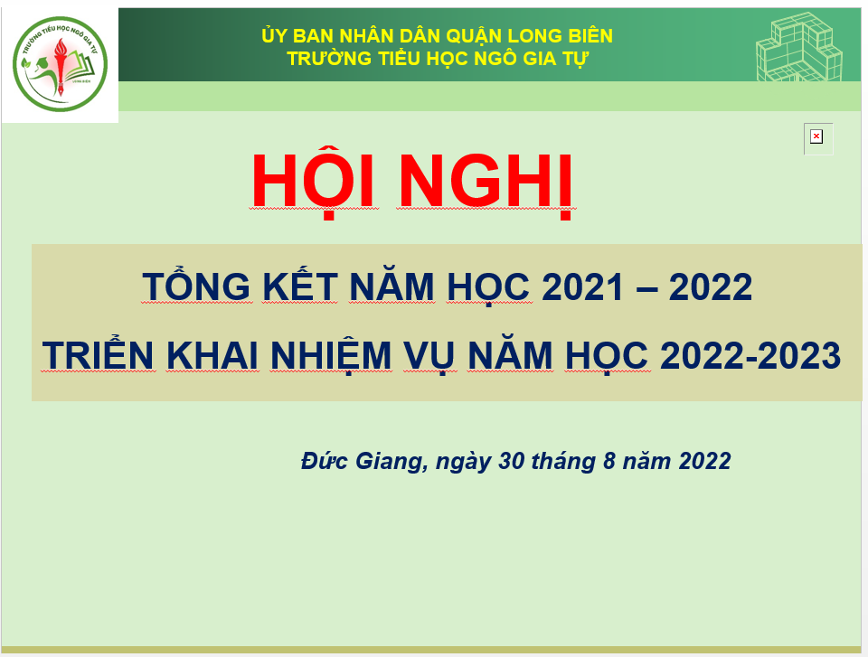 Trong không khí cả nước thi đua lập thành tích chào mừng 77 năm Cách mạng tháng Tám và Quốc khánh 2/9, chiều ngày 30/8/2022, trường Tiểu học Ngô Gia Tự đã tổ chức Hội nghị tổng kết năm học 2021 - 2022, triển khai nhiệm vụ trọng tâm năm học 2022 - 2023.