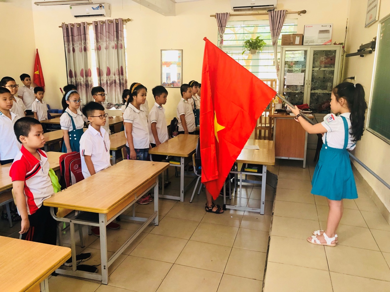 Đứng trước cờ Tổ quốc, cờ Đội, chân dung của Bác Hồ kính yêu , hơn 100 bạn đội viên mới đã cùng nhau hô vang lời hứa của người đội viên khi vinh dự được đứng vào hàng ngũ của Đội thiếu niên Tiền phong Hồ Chí Minh, đồng thời các bạn đội viên mới được tự tay mình thắt khăn quàng trên vai theo đúng nghi thức của Đội.