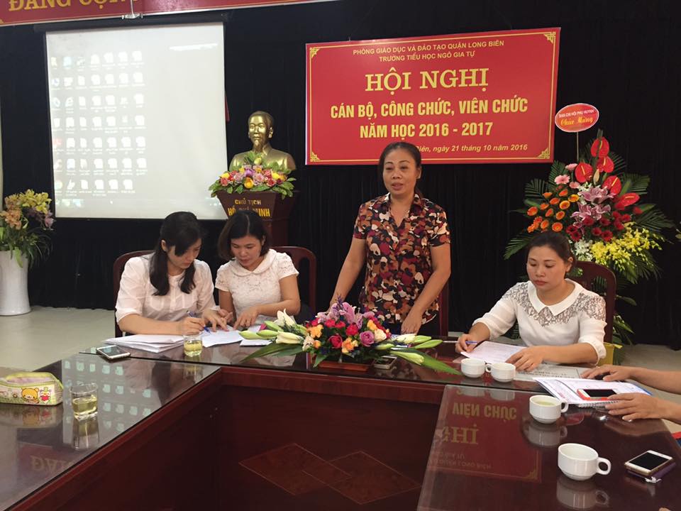 Ngày 21/10/2016, trường Tiểu học Ngô Gia Tự đã long trọng tổ chức Hội nghị cán bộ, công chức, viên chức năm học 2016 – 2017. Trong dự thảo phương hướng nhiệm vụ năm học 2016- 2017, đồng chí Hiệu trưởng Nguyễn Thị Ngọc Oanh đã nêu rõ những nhiệm vụ trọng tâm trong năm học mới và các giải pháp thực hiện. Trong đó, tập trung nâng cao chất lượng dạy học; tăng cường giáo dục đạo đức, kĩ năng sống; triển khai hiệu quả mô hình trường tiểu học mới; vận dụng có hiệu quả Phương pháp bàn tay nặn bột, Phương pháp dạy Mỹ thuật mới và thực hiện tốt đổi mới đánh giá học sinh tiểu học.